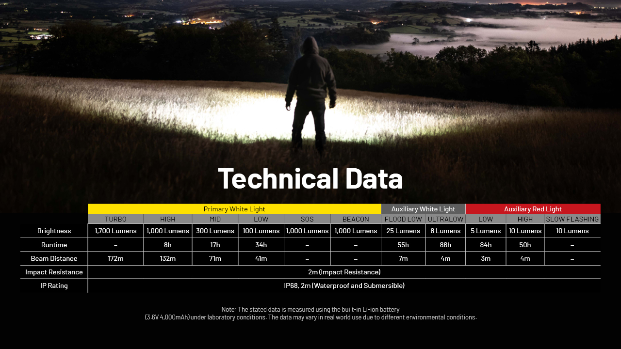 Lisainfo: toiteallika olekuindikaator, toiteallika pingeindikaator täpsusega 0,1V, viimase töörežiimi mälufunktsioon, elektrooniline pöördpolaarsuskaitse, tugevdatud kriimustuskindel mineraalklaas peegeldusvastase vääristusega, lennukialumiiniumist HAIII anodeeritud korpus, ATR (automaatne lambi töötemperatuuri reguleeriv) süsteem, alternatiivselt võimalik kasutada 1*18650, 2*CR123, 2*RCR123 toiteallikaid, taktikaline toitelüliti lambi tagaosas + külgmine režiimilüliti.